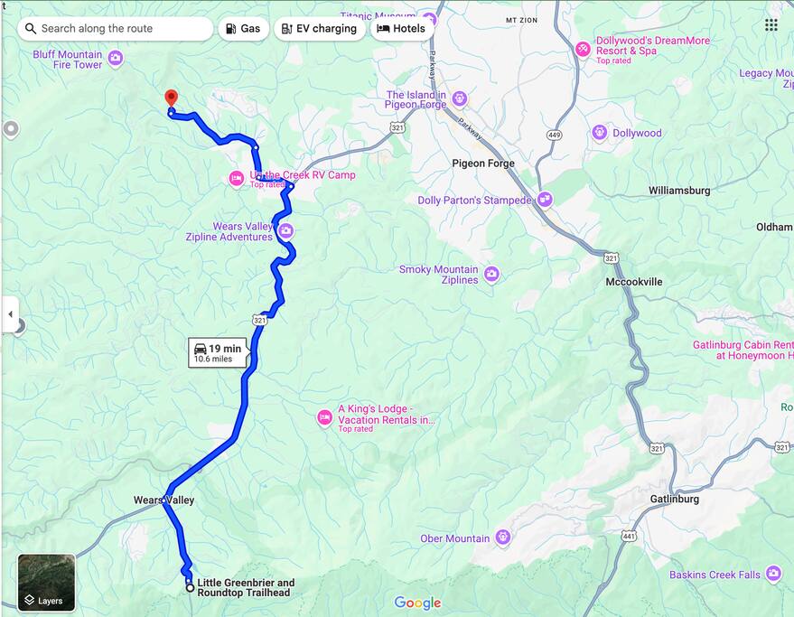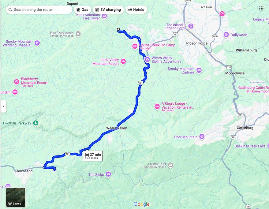 See maps in the photos: Location is: 5 miles (13 minutes) to the Parkway in Pigeon Forge; 9 miles (20 minutes) to Dollywood; Great Smoky Mountains National Park: 10 miles (19 minutes) to Little Greenbrier Trailhead Wears Valley Entrance; 13 miles (20 minutes) to the Gatlinburg Welcome Center; 15 miles (30 minutes) Great Smoky Mountain Visitors Center, Townsend Entrance 17 miles (30 minutes) to Sugarlands Visitor Center, 1420 Fighting Creek Gap Rd, Gatlinburg